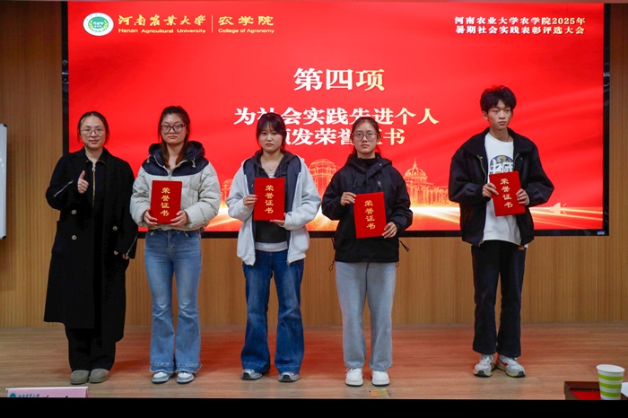团委教师依据实践成果进行点评。最终,“耕护青春行,沃土焕新生”实践团荣获一等奖,青禾烛光实践团与“科耕沃野,技筑丰年”社会实践团荣获二等奖,“心系花开,筑梦未来”实践团、“沃野深耕者,农情燎原行”——农业科普实践团和暖伴助障团荣获三等奖。同时,为任豫阳等12位先进个人以及郭睿宁等12位优秀工作者颁发奖项。