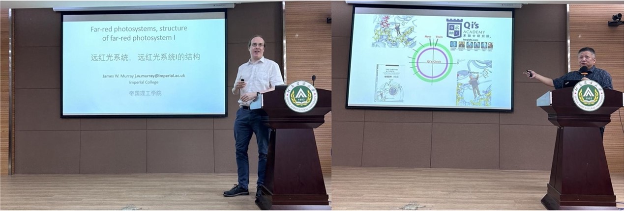 师生做了题为“Far-red photosystems, structure of far-red photosystem I”和“有助于科学研究的AI工具”的学术报告。报告中,Murray博士介绍了蓝藻含有多个psbA(D1)基因,并分析了不同D1突变体的活性中心结构,其中有一类特殊的D1,该类型的D1蛋白能够形成PSII复合物,并参与chl f的合成,报告最后,Murray博士展示并比较了不同类型far-red PSI的Cryo-EM结构。程奇教授则结合个人求学和工作经历给大家带了一场幽默风趣、丰富精彩的学术报告,全方面的从固氮酶基因的发现到其结构的解析由浅入深、娓娓道来,详细介绍了Lpor蛋白酶的单体、二聚体、高聚体的蛋白结构解析。不仅讲述了科学问题提出和解决的过程,更介绍了科学背后的科学故事。报告结束后,程奇教授与91吃瓜