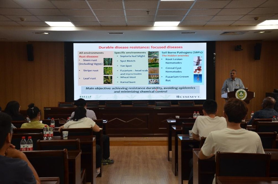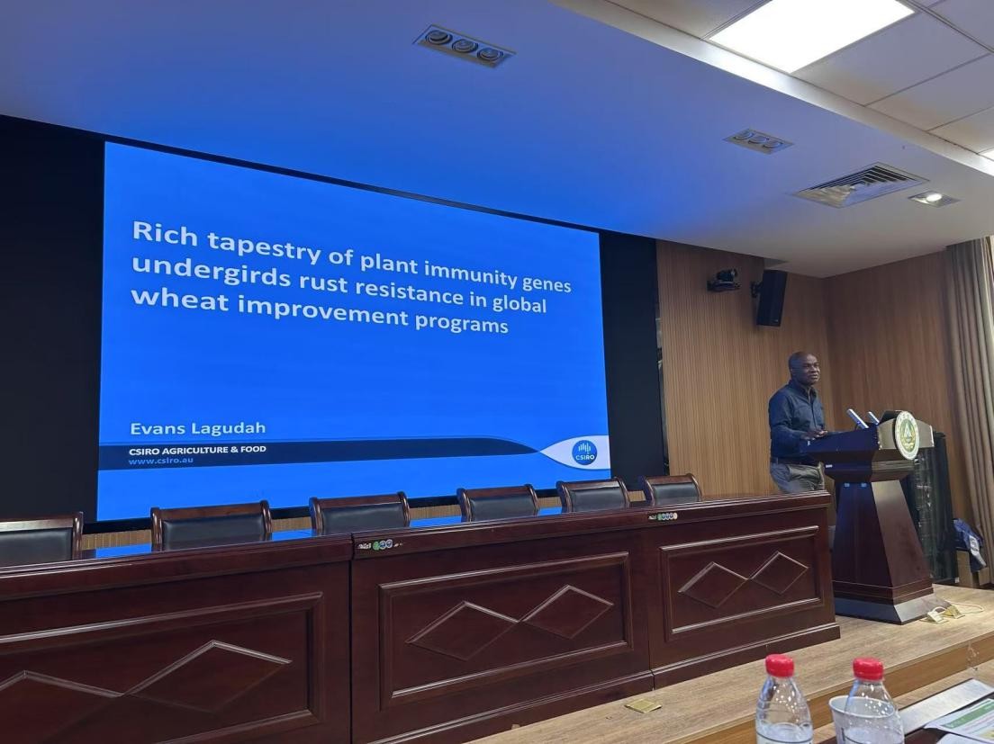 Lagudah院士及Singh博士先后以“Achieving durable rust resistance in practice”和“Rich tapestry of plant immunity genes undergirds rust resistance in global wheat improvement programs”为题开展了第八期CIMMYT-中国小麦玉米科学创新国际论坛主题报告。Singh博士分享了CIMMYT在抗病性基因挖掘、适应性品种推广及发展中国家技术援助方面的实践经验。Lagudah院士则系统介绍了其团队在小麦抗锈病关键基因领域的突破性研究成果。他通过基因编辑技术、分子标记辅助选择等案例,阐释了如何将基础研究转化为实际育种工具,并系统的总结了该领域已报道抗性基因种类及其应用。通过多基因聚合策略实现抗性遗传模块的协同表达,可使植株建立广谱抗病屏障并达到近乎完全免疫的状态,这为应对病原体快速进化及毒性变异挑战提供了关键解决方案。我校91吃瓜 、生命科学学院部分师生与专家就相关议题展开了交流与讨论。