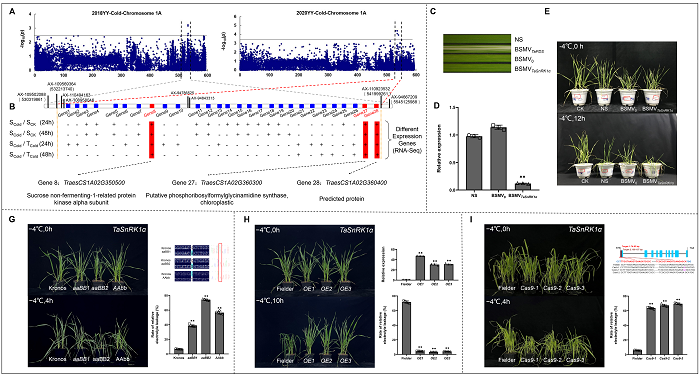 该研究通过整合GWAS和BSR-Seq数据结果,得到了3个冷胁迫相关基因。VIGS对3个候选基因进行初步功能验证后得到一个低温响应正调控基因TaSnRK1α,并通过EMS突变体、过表达和基因编辑实验,证明TaSnRK1α正向调控小麦低温抗性。