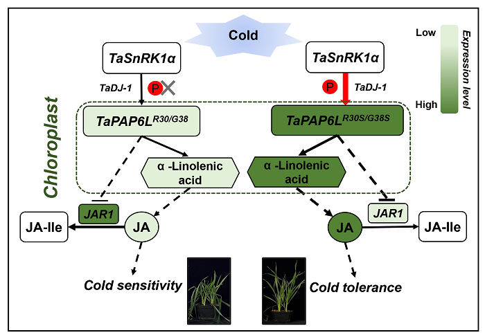 陈锋教授课题组在国际著名学术期刊Advanced Science在线发表了题为“A TaSnRK1α modulates TaPAP6L-mediated wheat cold tolerance through regulating endogenous jasmonic acid”的研究性文章。该研究克隆了2个低温抗性关键基因TaSnRK1α和TaPAP6L,并进行了低温响应功能证实和调控机制解析,由此提出TaSnRK1α-TaPAP6L模块通过调控茉莉酸(JA)含量增强小麦低温抗性的新机制,为我国小麦抗逆育种提供了重要基因资源,同时也为小麦低温响应的遗传基础和调控机理解析提供一定的理论基础。