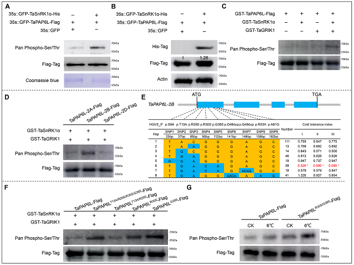 通过酵母双杂筛库,发现与TaSnRK1α与TaPAP6L蛋白互作。进一步通过体内外实验,验证了TaSnRK1α可以磷酸化TaPAP6L,并发现TaSnRK1α能够促使TaPAP6L蛋白丰富度增加。通过体外磷酸化比较TaPAP6L在不同亚基因组的3个同源基因,发现TaPAP6L-2B在调控小麦低温中可能发挥相对重要作用。结合对480份小麦品种中的TaPAP6L-2B测序结果,鉴定一个优势单倍型TaPAP6L-2BR30S/G38S,体外磷酸化实验证实R30S和G38S是影响TaPAP6L-2B低温抗性的重要磷酸化位点。