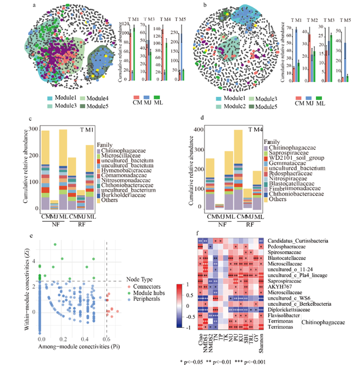 为了确定玉米种内间混作对根际细菌群落和养分利用的影响,文章选用了前期筛选出的两个根夹角和根构型不同的玉米杂交种,探讨了玉米间混作对根际和非根际细菌群落调控。证明了不同根夹角玉米品种间混作可提高养分积累、植株生物量和籽粒产量,明确了玉米品种间混作提高养分积累、植株生物量和籽粒产量的机制。与根夹角小的品种单作相比,间混作显著增加了土壤细菌多样性,改变了土壤细菌群落结构和共现网络模式,但与根夹角大的品种相比没有显著差异,说明玉米间混作对土壤细菌群落的影响直接受品种特性的影响。随机森林算法鉴定的Chitinophagaceae(o_Chitinophagales, c_Bacteroidia)和Saprospiraceae(o_Chitinophagales, c_Bacteroidia)细菌生物标志物与根际养分含量显著相关。该研究为玉米间混作根际生态位互补提高玉米养分利用效率和产量提供了新的理论支持,为该技术的应用提供了支撑。