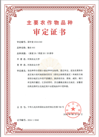 、国家小麦技术创新中心(筹)殷贵鸿研究员小麦科技创新团队最新培育的小麦新品种豫农905通过国家审定,审定编号:国审麦20241040。该品种是综合运用常规定量育种+双单倍体育种 (DH)+分子标记辅助育种(MAS)+抗病性接种和抗逆性鉴定+就地一年4次加代技术+品质平行测定筛选等先进技术,一年实现稳定(2018年),2019-2023年参加2年国家统一新品系比较试验、2年国家统一区域试验和1年国家统一生产试验,从育成到审定仅仅用了6年时间,较常规育种技术选育的小麦新品种缩短了7-8年,有效解决了小麦常规育种周期长、效率低的行业难题。豫农905主要优点有三个,一是高产、稳产。产量三要素协调(平均亩穗数40-43万,穗粒数37-39粒,千粒重45-47克),丰产性突出,高产田产量水平650-850 公斤/亩。5年参加国家统一新品系比较、区域和生产试验等五组试验108点次汇总,平均亩产581.8公斤,较对照品种周麦18和周麦36分别平均增产4.0%、3.19%,均达极显著水平。二是多抗、广适。半冬性,冬季抗寒性好,耐春季低温能力较好;株高 76cm,抗倒性较好;慢条锈病,中抗黄花叶病,中感纹枯病;根系活力强,耐旱性较好,抗干热风,耐后期高温,落黄好;适宜在黄淮冬麦区南片的河南省除信阳市(淮河以南稻茬麦区)和南阳市南部部分地区以外的平原灌区,陕西省西安、渭南、咸阳、铜川和宝鸡市灌区,江苏省淮河、苏北灌溉总渠以北地区,安徽省沿淮及淮河以北地区高中水肥地块早中茬种植。三是优质中强筋。白粒,角质,粒饱、粒匀,黑胚率低,容重高,出粉率高,携带