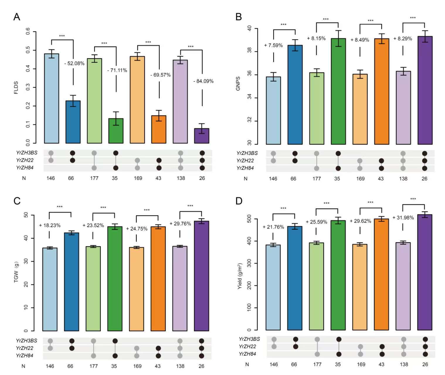 周8425B对条锈和叶锈病具有持久和广谱的成株期抗性,前人已发现其携带有YrZH84、YrZH84.2、YrZH22、Yr30和Yr9等多个抗条锈病基因。利用245份材料的GWAS结果和周8425B高质量基因组物理图谱,该研究在3B染色体鉴定到了一个新的成株期条锈病抗病位点YrZH3BS。进一步研究发现YrZH3BS与YrZH22和YrZH84具有显著的正向互作关系,同时携带这三个抗病位点的小麦品种可以显著降低其条锈病感病指数84.09%,同时对每穗粒数提高8.29%,千粒重提高29.76%,产量提升了31.98%(图2)。这些结果表明周8425B集成了众多优良抗病基因,实现了抗病性与丰产性的协同改良。