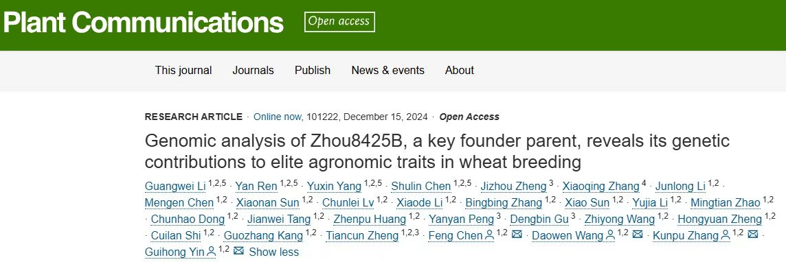 王道文、陈锋和殷贵鸿团队在Plant Communications上在线发表了题为“Genomic analysis of Zhou8425B, a key founder parent, reveals its genetic contributions to elite agronomic traits in wheat breeding”的研究论文。该研究绘制了中国小麦骨干亲本周8425B高质量基因组物理图谱,以周8425B中1RS易位染色体臂为基础探讨了不同遗传背景中1RS的结构变异特征,挖掘到一个小麦成株期条锈病抗性新位点