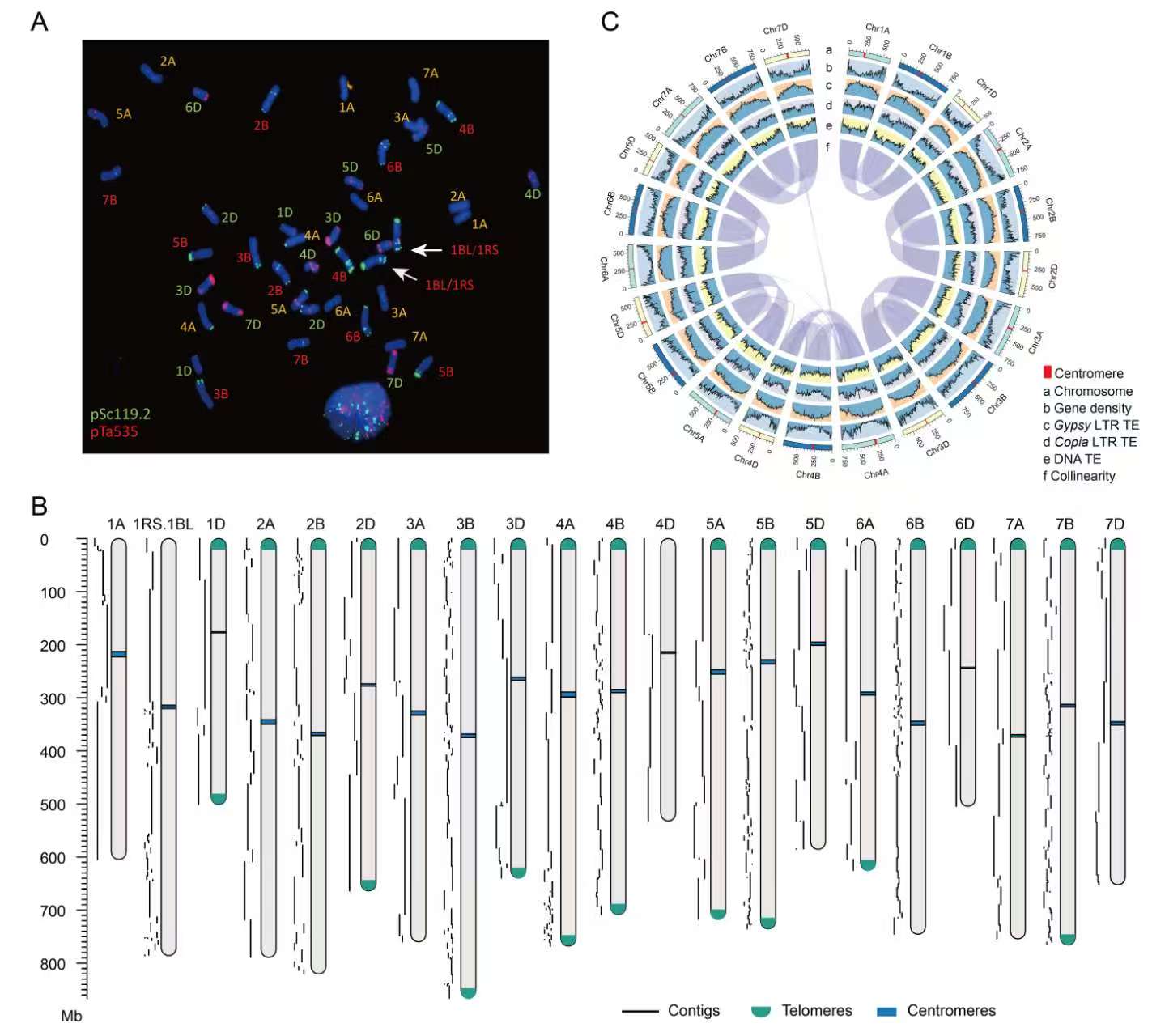 利用12个不同发育时期的组织样品进行转录组测序,通过分析鉴定出96,728个可表达的HC基因;构建的基因表达网络中存在22个共表达模块,从中发现了2个位于1RS上的特异基因,可能影响小麦籽粒发育和淀粉合成等重要农艺性状。基因组序列比较发现不同遗传背景中的1RS存在较多结构变异,尤其是在周8425B的1RS染色体亚端粒区发现了20.5 Mb的非共线区域,分析发现此区域是由单体长度分别380、571和118 bp串联重复序列组成,这些串联重复序列与前人在麦类物种细胞遗传学研究中广泛使用的分子探针pSc200、pSc250和pSc119.2含有的序列高度一致,我们发现这些串联重复序列的物理位置关系很好地解释了前人细胞遗传学实验观察的原位杂交结果。值得指出的是,这一结果也在近期发表的小麦泛基因组研究中得到验证(Jiao et al., Nature, 2024),即1RS亚端粒区域超长串联重复序列是其染色体上的一个重要结构特征。