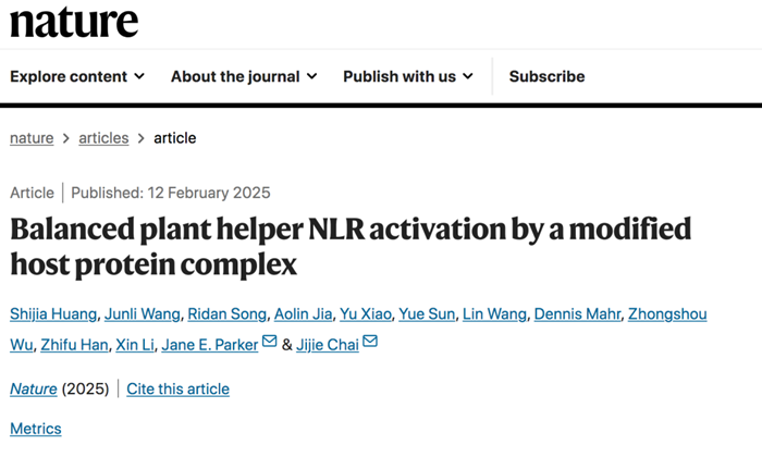 贾奥琳教授联合西湖大学柴继杰教授及德国马普研究所Jane E. Parker 教授,以共同第一作者在世界顶级期刊《自然》发表了表题为“Balanced plant helper NLR activation by a modified host protein complex”的最新研究论文。该成果提出了TNL类抗病蛋白产生的免疫信号分子,ADPr-ATP,作为“危险信号”使EDS1-SAG101复合物构象发生变化,进而来激活下游辅助蛋白NRG1A的免疫应答机制;首次解释了植物NLR被非效应蛋白激活的分子机制;也揭示了NRG1C蛋白通过竞争结合了“危险信号”的EDS1-SAG101来负调控辅助蛋白NRG1A介导的免疫反应的负调控机制。