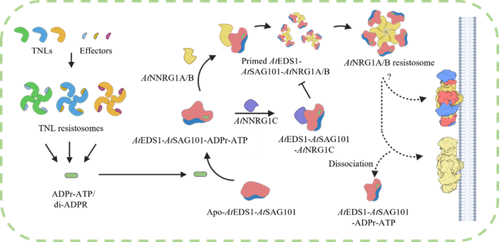 NRG1,由此形成ADPr-ATP/di-ADPR、EDS1-SAG101和NRG1的新单元,最终形成具有钙离子通道活性的“