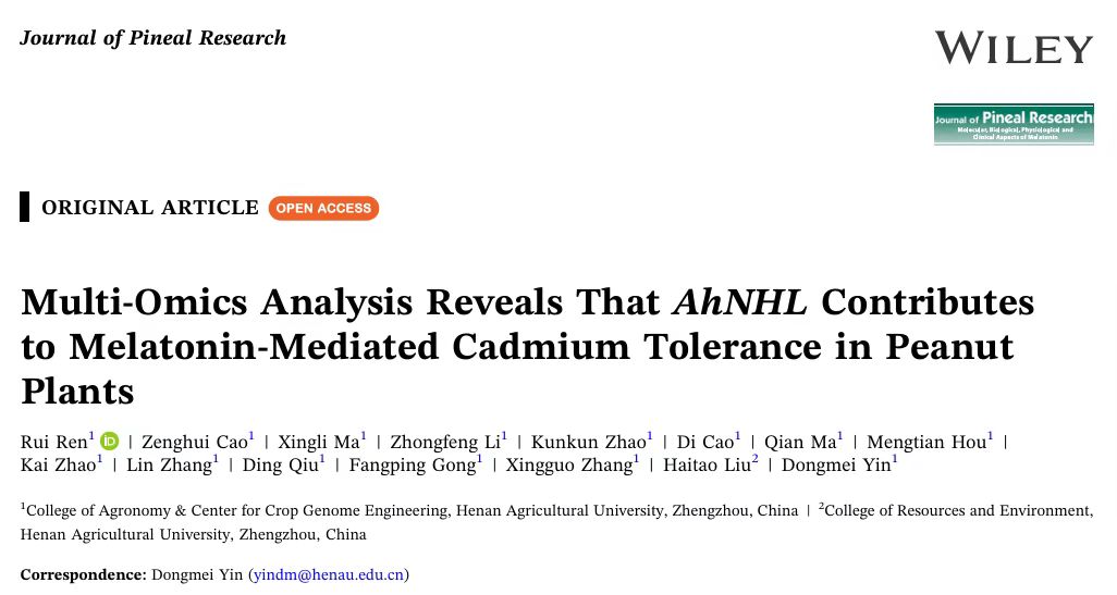 殷冬梅教授团队在国际知名期刊《Journal of Pineal Research》(中科院一区,IF: 8.3)发表题为“Multi‐Omics Analysis Reveals That AhNHL Contributes to Melatonin‐Mediated Cadmium Tolerance in Peanut Plants”的研究论文,解析了内源褪黑素信号通路介导的花生新品种农大花108耐逆新机制。