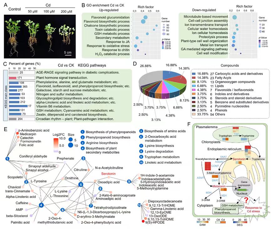 花生(Arachis hypogaea L.)是一种重要的油料和经济作物,在全球 100 多个国家均有种植。环境污染尤其是有害重金属的污染,严重阻碍了优质花生产品的生产。在前期研究中,发现花生品种农大花108(H108)耐镉胁迫。本研究通过多组学分析和生理学研究技术,发现包括褪黑素(MT)生物合成在内的多个生物过程参与了农大花108对镉的耐受。在镉胁迫下,将外源褪黑素应用于花生植株,可使根、茎和种子中的镉积累减少 40%-60%,并提高抗氧化能力。综合研究发现,褪黑素介导的镉耐受主要归因于亚麻酸,谷胱甘肽(GSH)和苯丙素(木质素)代谢的增强,以及根细胞壁中凯氏带的发育。