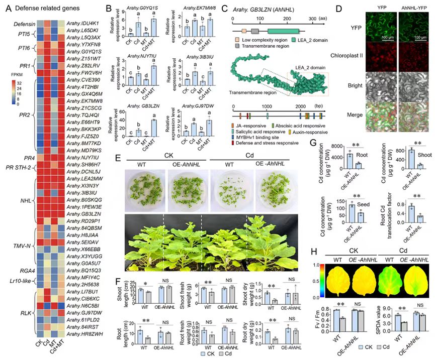 花生中的防御基因,如花生中NDR1/HIN1基因(AhNHL),在镉胁迫下也显著上调。在烟草中过表达 AhNHL 基因可使镉积累减少 37%-46%,并减轻镉胁迫引起的光合作用抑制。转录组分析表明,AhNHL 主要通过促进苯丙素生物合成和谷胱甘肽代谢来赋予花生对镉的耐受性。此外,外源性谷胱甘肽通过提高花生植株对镉的蓄积能力和抗氧化能力有效地缓解了镉胁迫,而应用谷胱甘肽生物合成抑制剂(半胱氨酰硫代乙酰胺)则加剧了镉的植物毒性。转录组分析揭示,外源性谷胱甘肽通过影响参与转录调控、金属离子结合和转运的基因的表达来提高镉耐受性。我们的研究结果为植物对镉耐受性的分子机制提供了新的见解,这将有助于低镉花生品种的培育。