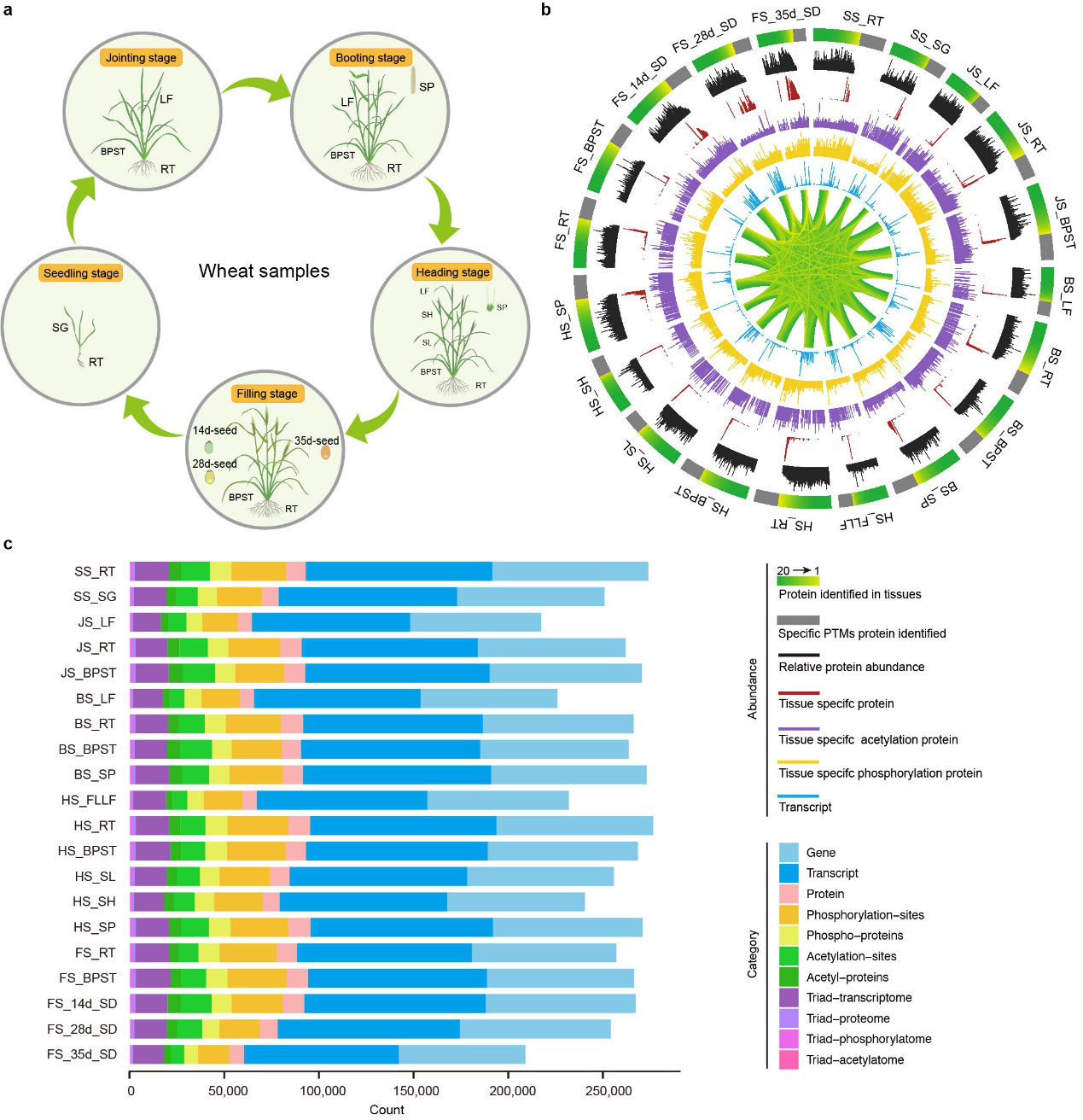 小麦作为复杂的六倍体,基因组已经测序,目前已经进入重大基因克隆和功能机制解析阶段。多组学数据可以提供不同层次的生物分子信息,为系统地解析复杂的生物学现象提供引领。目前小麦中尚未有高通量蛋白和修饰组的相关数据库,为了推动小麦领域重要农艺性状基因的机制研究,作者构建了首个高通量的多组学图谱,包含小麦全生育期20个组织(根,茎,叶,穗,种子等)的132,570个转录本,44,473个蛋白质,19,970个磷酸化蛋白和12,427个乙酰蛋白 (图1)。利用该图谱,作者阐明了小麦全生育期超过90万调控关系的转录调控网络 (GRN) ,并提供了20个组织特异性的GRN; 提出了翻译后修饰(PTM)和转录表达对蛋白质丰度的相对贡献(PTC);分析了多组学水平的同源基因表达的偏好性,发现转录组和蛋白组存在明显的D基因组表达偏好,而修饰组则无表达偏好性。系统分析了小麦发育、品质和抗病相关基因/蛋白,鉴定到控制小麦籽粒品质和抗病相关的新的磷酸化和/或乙酰化修饰位点和GRN,这些研究和发现可加速小麦重要农艺性状机制研究进程。