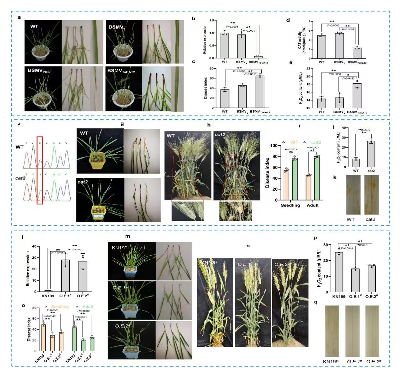 为验证TaCAT2抗病功能,本研究通过病毒诱导基因沉默技术(VIGS)、突变体(EMS)和过表达转基因技术对TaCAT2进行功能验证。结果显示,当TaCAT2基因沉默时,小麦植株苗期和成株期的茎基腐病抗性均显著下降;当TaCAT2基因过表达时,小麦植株苗期和成株期抗性均显著增强。由此表明,TaCAT2基因正向调控小麦茎基腐病抗性。