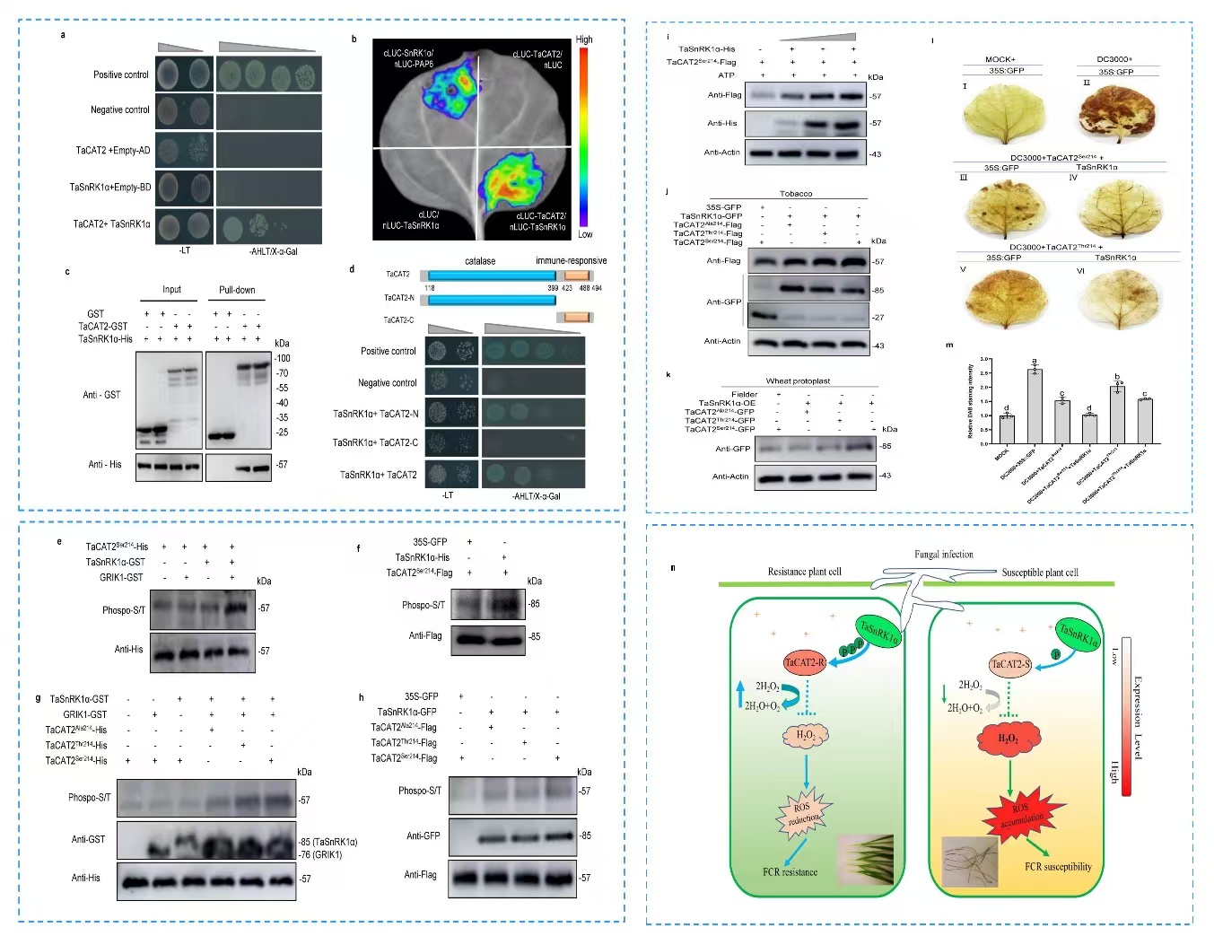 进一步以TaCAT2为诱饵进行酵母文库筛选,鉴定出一个互作蛋白激酶TaSnRK1α,并利用酵母双杂交技术、萤火素酶互补及Pull-down试验验证了互作关系。同时对TaCAT2单倍型筛选,找到一个抗性单倍型TaCAT2-R,并发现TaCAT2-R有一个关键磷酸化位点Ser214,体内外磷酸化验证了TaSnRK1α对TaCAT2-R的磷酸化作用。同时在烟草和小麦原生质体中证实TaSnRK1α对TaCAT2-R的磷酸化可增强后者的蛋白稳定性,从而增强TaCAT2-R在植物体内清除活性氧的能力,由此调控小麦茎基腐病抗性。本研究可为我国小麦茎基腐病抗病育种提供重要的基因资源,同时为小麦茎基腐病的遗传机制和调控机理解析提供了重要理论基础。