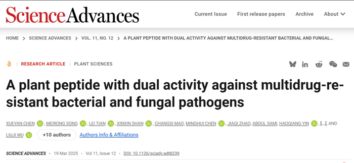 吴刘记团队联合中国农业大学朱奎团队、动物医学院杜向党团队,在Science 子刊Science Advances发表了题为“A plant peptide with dual activity against multidrug-resistant bacterial and fungal pathogens”的研究论文。该工作基于学科交叉研究,从1000个玉米内源肽中筛选鉴定到了一个具有广谱抗菌活性的新型小肽NCBP1,发现该新型小肽具有对动物病原细菌和植物病原真菌的双重抗菌效力,并进一步揭示了其抗菌作用机制,为抗菌活性分子筛选和新型抗菌药物开发提供了新思路、开辟了新路径。