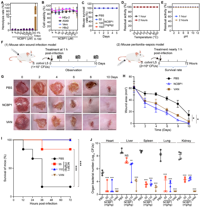 另外,NCBP1具有良好的安全性、稳定性和体内有效性。NCBP1对多种哺乳动物细胞均未表现出明显的细胞毒性,在高温(100℃)和酸碱条件(pH 2-12)下仍能保持其抗菌活性。通过小鼠皮肤感染模型和腹膜炎-败血症模型,评估了NCBP1在体内的抗菌效果。结果显示,NCBP1能够显著加速伤口愈合,并减少伤口中的细菌负荷。在腹膜炎-败血症模型中,NCBP1能够有效降低小鼠主要器官中的细菌数量,并显著提高小鼠的存活率。这些结果表明,NCBP1在治疗耐药菌感染方面具有潜在的应用价值。
