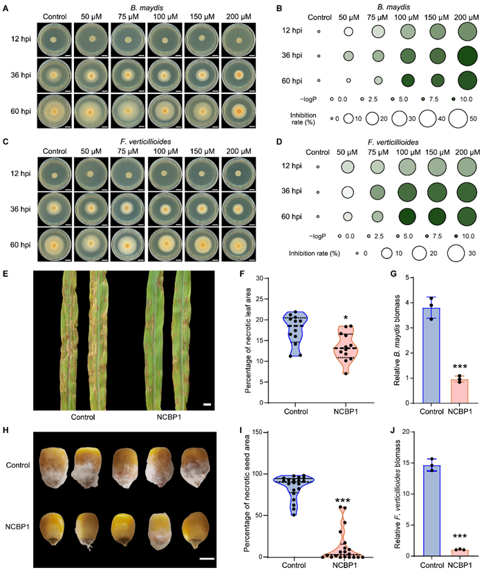 鉴于植物病原真菌持续对全球农业生产造成的严重经济损失,研究人员进一步探讨了NCBP1对植物病原真菌的抗性及其在玉米抗病中的作用。研究结果表明,除了抗细菌活性,NCBP1还表现出抗真菌效果:能够有效抑制多种植物病原真菌的生长,如玉米小斑病病原菌玉蜀黍平脐蠕孢菌和玉米种腐病病原菌拟轮枝镰孢菌。进一步研究表明,通过外源施加新型小肽NCBP1,可显著增强玉米对小斑病和种腐病的抗性,并显著减轻病害症状。以上结果表明:新型小肽NCBP1具有对动物病原细菌和植物病原真菌的双重抗菌效力。