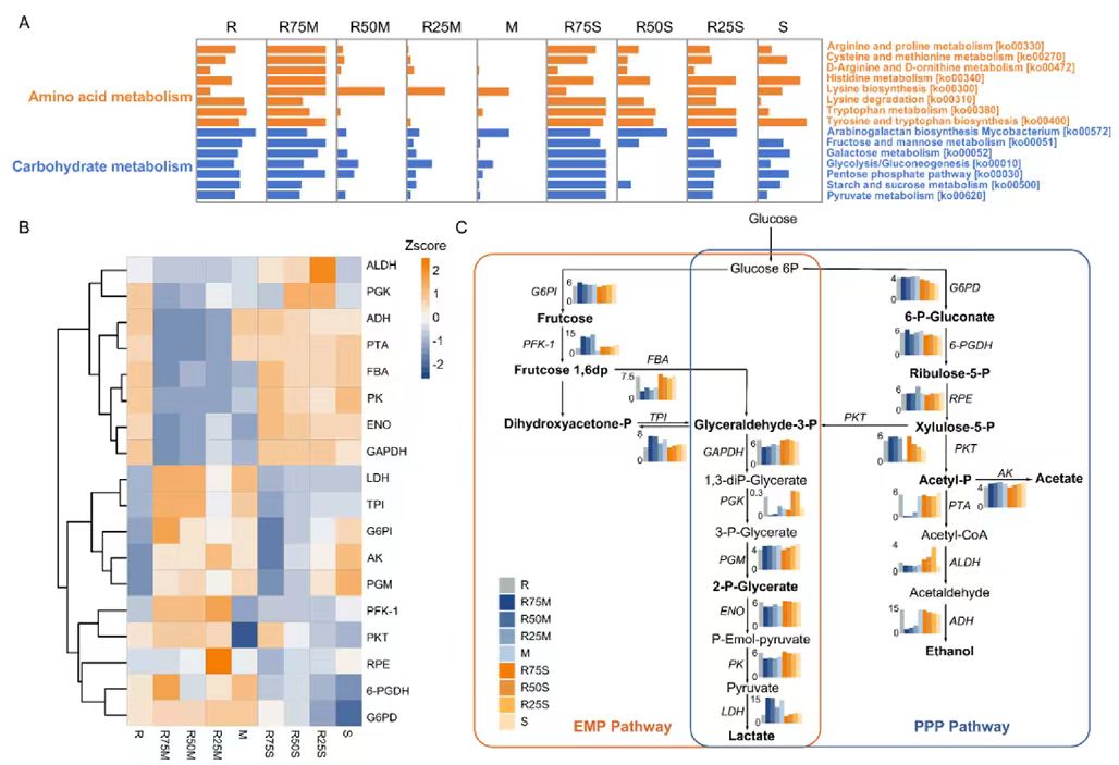 本研究聚焦于微生物发酵技术在青贮饲料中的应用,通过将水稻秸秆与玉米或高粱-苏丹草进行混合青贮,分析其发酵动态和饲料质量变化。研究发现,与高粱-苏丹草相比,水稻秸秆与玉米混合青贮显著提升了发酵质量,降低了纤维含量,并增加了乳酸产量。在最佳的混合比例(水稻秸秆与玉米75:25)下,中性洗涤纤维和酸性洗涤纤维的含量达到最低,乳酸浓度最高(39.37 g/kg DM)。此外,混合青贮促进了有益乳酸菌(如乳杆菌科和芽孢乳杆菌科)的生长,提高了发酵效率。通过接种植物乳杆菌,进一步增强了青贮饲料的稳定性,抑制了有害肠杆菌的生长。