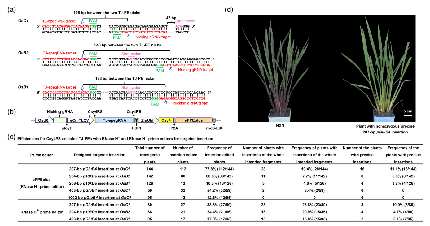 苗春波和李俊周教授领衔的研究小组优化了模板跳跃式引导编辑(Template-jumping Prime Editing, TJ-PE)系统。通过引入Csy4 pre-pegRNA加工系统(Csy4PS)和恢复植物引导编辑器ePPEplus(engineered plant prime editor plus, ePPEplus)的RNase H结构域,研究团队开发了Csy4PS辅助的TJ-PE系统。这些创新使水稻基因组中高达710 bp的靶向插入成为可能,并实现了数百个碱基对(202-403 bp)的精准插入和替换,为作物遗传改良提供了坚实的技术支撑。本研究扩展了PE在植物中的编辑范围,为作物育种领域提供了一种极具价值的基因组编辑工具,对保障粮食安全具有重要的战略意义。