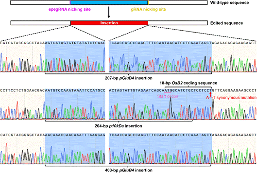 RNase H+ TJ-PE介导的207-bp pGluB4、204-bp p10kDa和403-bp pGluB4精确插入