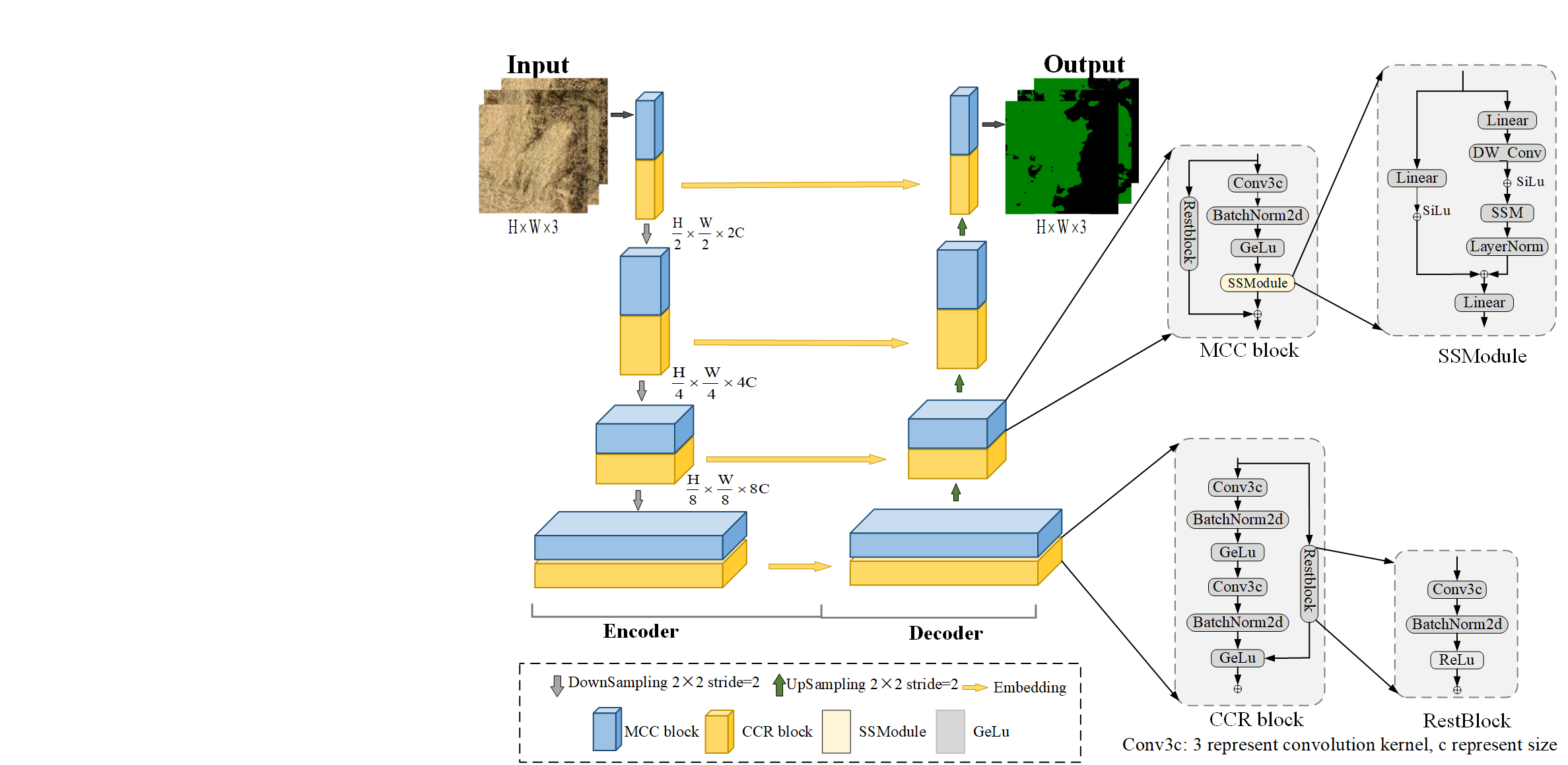 UssNet算法模型中的每一层编码器与解码器配置相互对应,组成一个U形结构,该模型的编码器与解码器结构具有对称性,研究通过UssNet集成了MCC块,CCR块,SSModule块和RestBlock块。关于编码器部分,模型由MCC模块和CCR模块交叉组成,MCC模块主要负责样本关联性的特征提取,CCR模块则负责图像纹理和图形的提取。其中编码层包含2个MCC和2个CCR,共计4个编码模块。每经过一次特征提取则加入一个最大池化层作为模型的下采样,下采样图像的尺寸会减少(1/2)^n,n是层数。解码器和编码器的结构相互对应,但是每个编码器的下采样部分使用上采样代替。在原始UNet模型中的上采样部分使用邻近插值法,UssNet为了提升MIou精度与分割边缘的精细度,使用双线性插值法取得了更高精度。