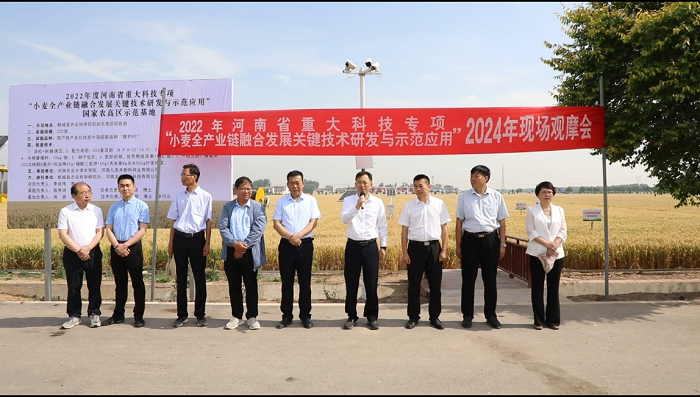 本网讯(通讯员 豆根生 马耕)5月20日,时值“小满”节气,小麦粒饱籽满,麦浪滚滚,丰收在即。河南省重大科技专项“小麦全产业链融合发展关键技术研发与示范应用”科技成果现场观摩会在周口国家农高区举办。校党委书记李成伟、河南省科技厅现代农业农村科技处副处长徐志华,周口国家农高区管委会主任韩卫东、我校91吃瓜