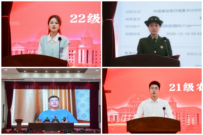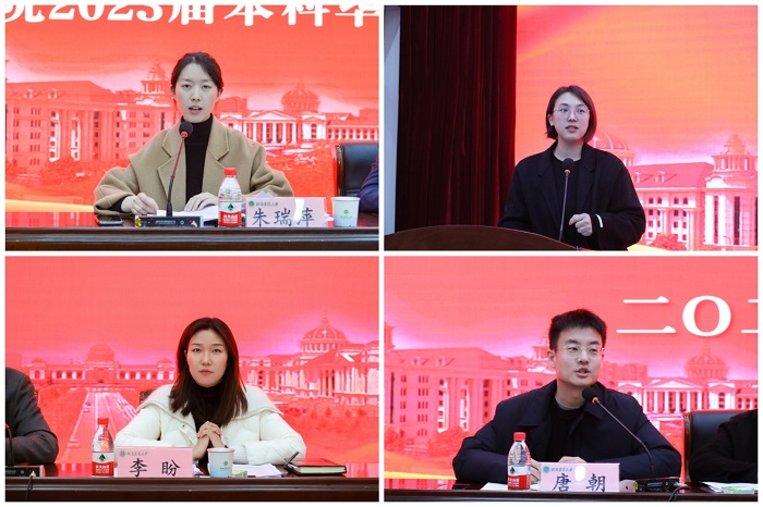 研究生就业管理办法》和《2023届本科毕业生就业创业工作实施办法》。相关就业代表雷邵亮,创新创业代表龙昊驰,考取研究生代表杨寒星,退役士兵代表范嘉琪分别进行了发言,他们结合自身经历从不同的职业选择方向给予毕业生不同的建议。