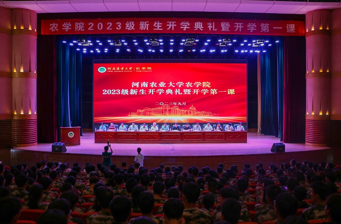 党委书记马菲发表讲话,代表学院向2023级全体新生的到来表示热烈的欢迎,向每位入学的新同学送去了美好的祝愿。恰逢九一八事变92周年纪念日,他警醒同学们勿忘国殇,警钟长鸣。 他强调农业强国是社会主义现代化强国的根基,农业是基础。河南是农业大省,我校是农业大学,新时代农村是充满希望的田野,是干事创业的广阔舞台,各位在座的同学责任重大,前景光明。作为一名农学人,他呼吁同学们厚植爱农情怀,练就学农本领,为加快推进农业农村现代化贡献青春力。为了农业更好的发展与未来,他向全体新生提出四点期许。