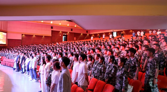 伴随着雄壮的《义勇军进行曲》,与会领导和现场师生共同唱响国歌,新生开学典礼暨开学第一课就此拉开序幕。