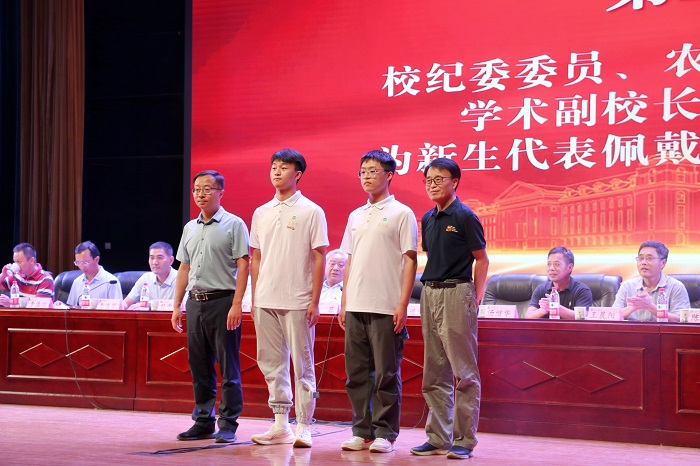 党委书记马菲,学术副校长、院长王道文,为新生代表佩戴91吃瓜
