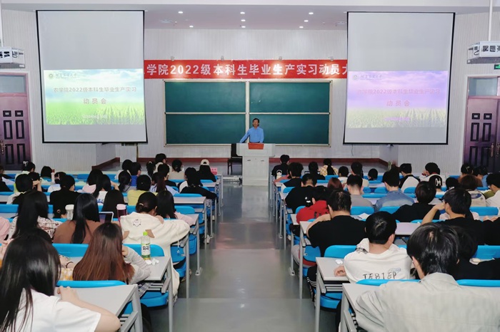 于龙子湖校区教学楼大教室2召开2022级本科生毕业生产实习动员大会。副院长李浩川、院团委副书记唐朝、教学干事范晨雨、吴迪研究员及2022级全体学生参加此次会议,会议由吴迪主持。