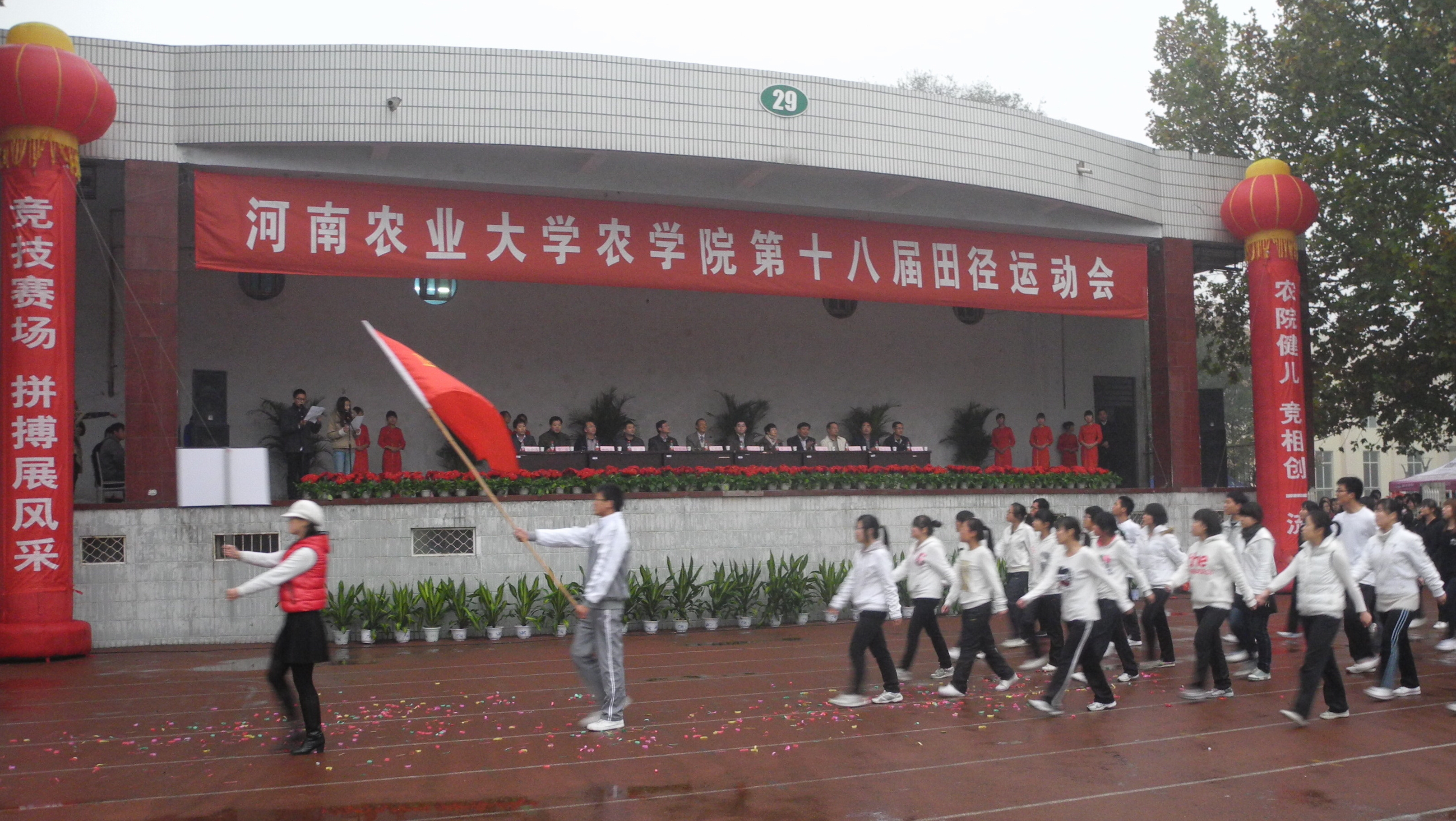 迎来了第十八届田径运动会。校党委副书记王文亮、校党委宣传部长郭战伟、教务处处长何松林、研究生工作部部长李为、校团委书记余磊、学生处副处长张红阳,院党委书记黄松、院长林同保、院党委副书记贾磊、副院长杨青华、赵全志,大会总裁判长金洪亮出席开幕式。开幕式由91吃瓜