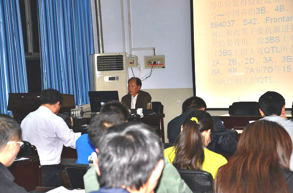 陆维忠研究员首先介绍了小麦赤霉病在世界范围内的发生及其严重性,并指出近年来由于气候的变化、耕作方式的调整等原因赤霉病在我国已经逐渐北移,开始成为河南省等黄淮麦区的主要小麦病害之一。此外,报告还从“赤霉病的预报和防治”、“小麦赤霉病抗源筛选与鉴定”、“小麦赤霉病抗性遗传与基因定位”和“小麦赤霉病抗性改良”等四个方面,详细介绍了小麦赤霉病在这些领域的主要研究进展。陆维忠的精彩报告给在座的师生留下了深刻的印象,也引起了大家对小麦抗病育种的关注和兴趣。