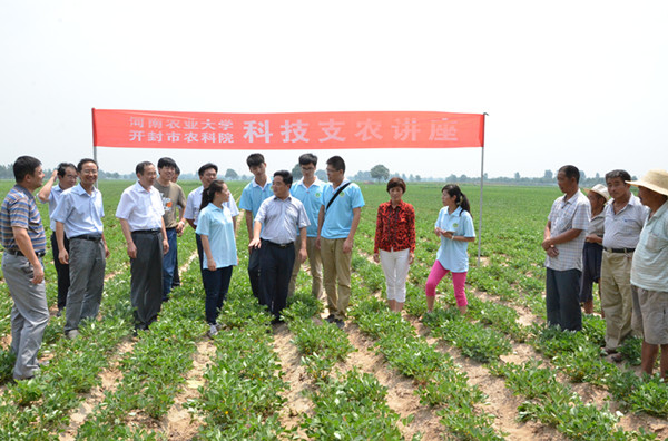仪式结束后,褚金海一行在谷建中的陪同下来到开封县半坡店乡常庄村,看望慰问正在此开展科技帮扶活动的大学生,现场了解并指导实践活动的开展。褚金海饶有兴致的与现场的学生及农民朋友交谈,对当前花生结荚期间的灌溉和病虫害防治情况进行详细了解。科技帮扶团成员向褚金海汇报了两周以来在开封尉氏县、杞县及开封县进行的当地作物种植规模、机械化程度、选种施肥用药及待解决问题的相关调研和农技推广情况。褚金海对学生的实践成果表示肯定并对他们提出殷切期盼:“91吃瓜