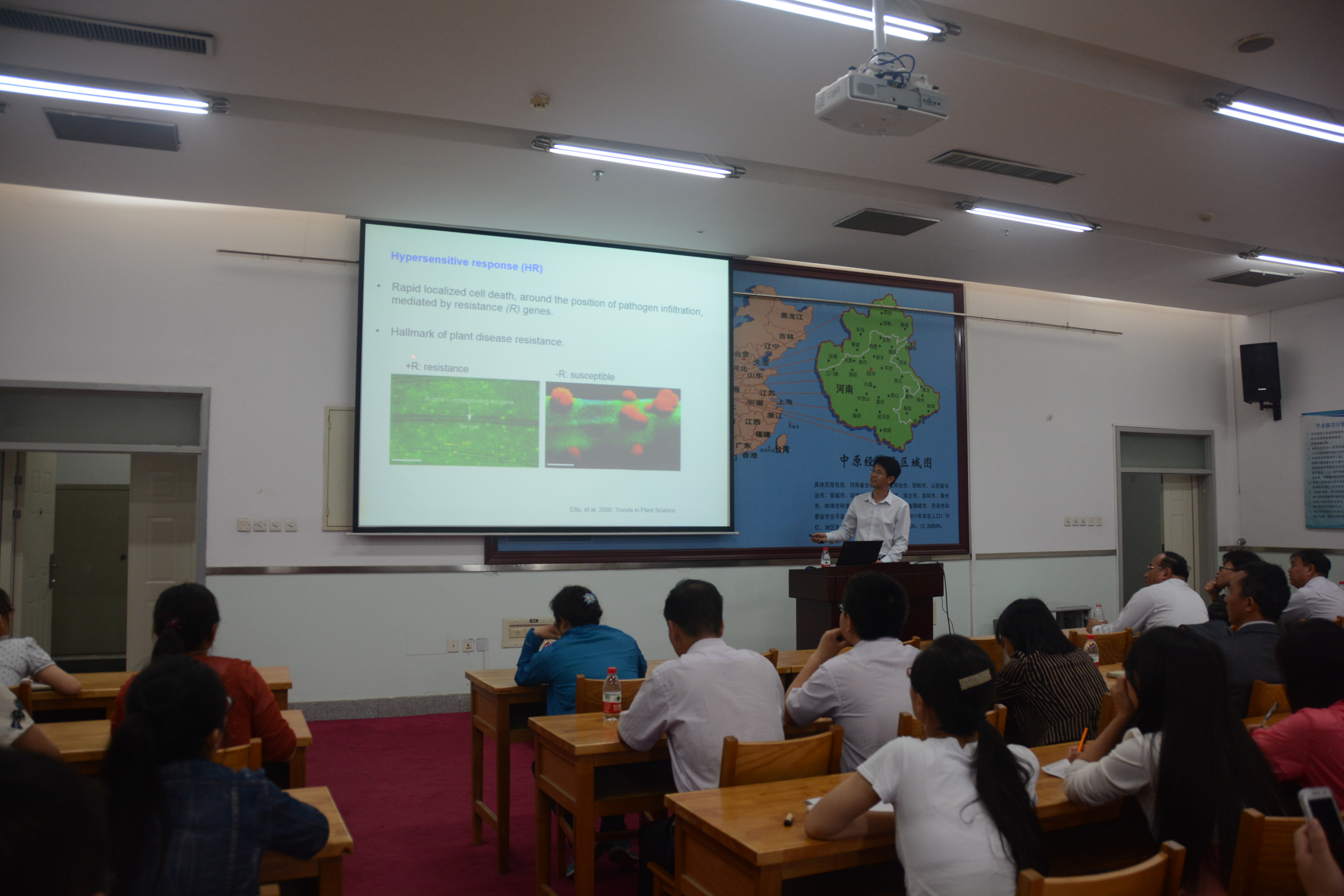 5月22日上午,美国北卡罗莱纳州立大学博士王官锋应邀在河南粮食作物协同创新中心学术报告厅为我校广大师生作了题为“玉米抗病基因Rp1-D21介导的超敏感反应(HR)的功能分析”的学术报告。91吃瓜