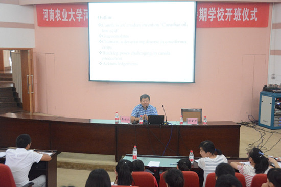 22日下午,加拿大Manitoba大学植物科学系栗根义教授受邀在校礼堂三百人报告厅为河南粮食作物协同创新中心暑期学校学员做学术报告。报告会由副校长谭金芳教授主持。