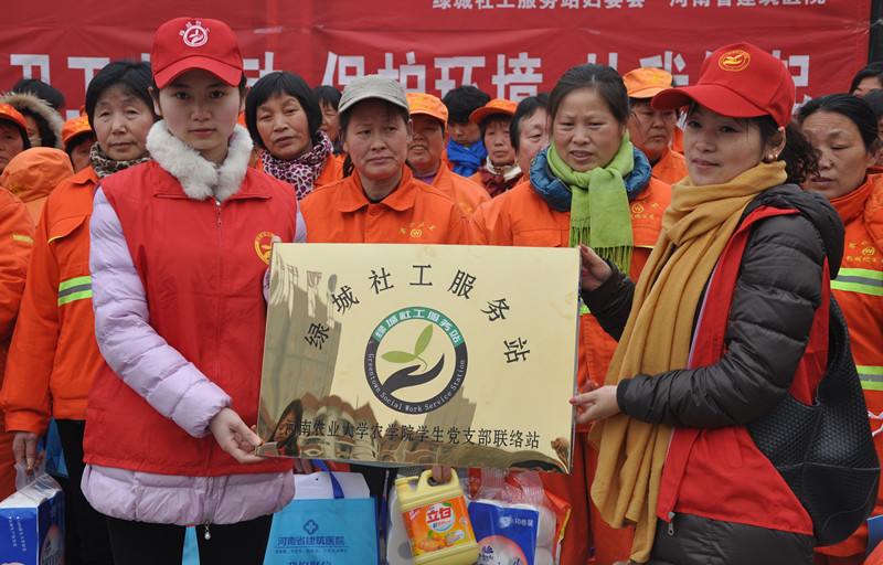 联络站正式挂牌成立,志愿者代表从绿城社工服务站负责人的手中接过联络站的牌子和证书,并参加了服务站开展的“庆三八学雷锋——爱心礼包温暖环卫女工”公益服务活动,与环卫工人共度一个快乐而温暖的节日。