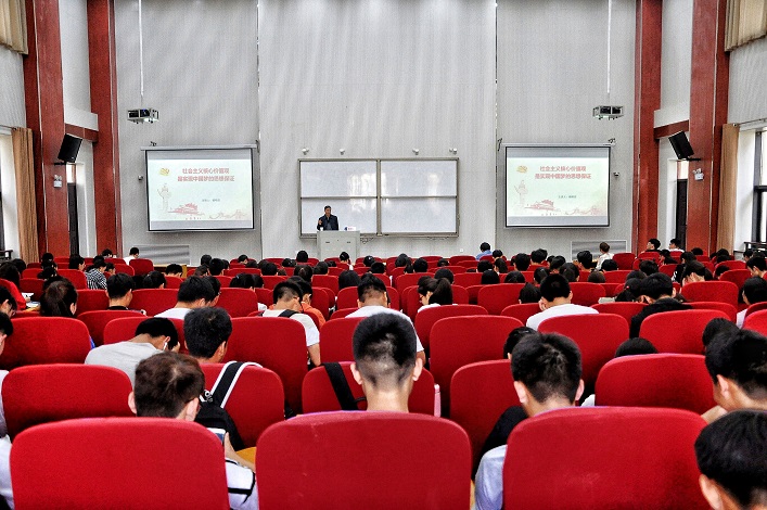 杨教授围绕“社会主义核心价值观的内容”、“社会主义核心价值观对当代大学生的影响及意义”、“如何践行社会主体核心价值观”等方面进行详尽生动地报告。报告会中,杨教授着重强调了习近平总书记在北京大学师生座谈会上的讲话中给广大青年提出的四点希望:一要爱国,忠于祖国,忠于人民;二要励志,立鸿鹄志,做奋斗者;三要求真,求真学问,练真本领;四要力行,知行合一,做实干家。