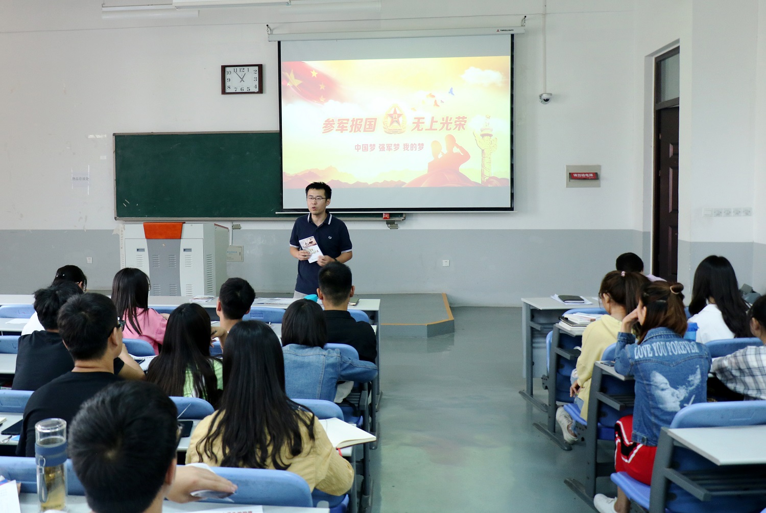 会议开始,全体人员一同观看了全国征兵入伍宣传片,并现场领取了入伍相关宣传材料。随后,团委副书记梁皓以PPT的形式向同学们详细传达了学校关于征兵宣传的相关文件要求,并对2019年度征兵工作就时间节点、政策支持、优惠奖励、注意事项等多方面进行了具体说明。他号召大家主动履行兵役登记义务,响应国家号召,鼓励同学们把个人理想融入强军梦、强国梦、青春梦,在热血青春中实现自我人生价值。