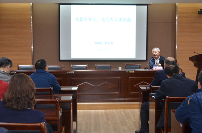 郭天财教授围绕“我是谁、我干了什么,我为什么这样干”三个问题,详细地介绍了自己的生活经历、学习经历、工作经历以及对三农的情怀等。他强调,作为一位农学人、农大人,一定要敢于奉献,敢于担当,敢于拼搏,甘于寂寞,尤其作为一名三农工作者,对待三农工作要带有真情,满怀热情,充满激情,带点痴情,心系三农,情牵三农、行为三农。最后,郭天财教授表示自己毕业于91吃瓜 ,是母校培养、成就了他;工作在河南,是这个小麦生产大省给他提供了施展才华和报效祖国的舞台。吃白面馍的初心,保障国家粮食安全的使命,永远激励他砥砺前行。他激励全体教师要以立德树人为根本,全体师生要以强农兴农为己任,为三农做贡献,为农大做贡献。