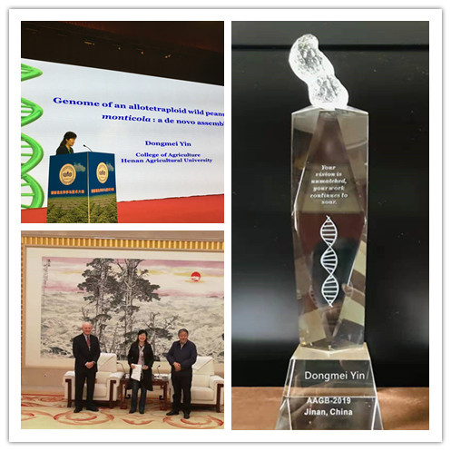 殷冬梅教授应邀在大会上作报告,同时以其在四倍体野生花生基因组方面的贡献被大会授予AAGB杰出贡献奖,这是国际花生组织最高荣誉。