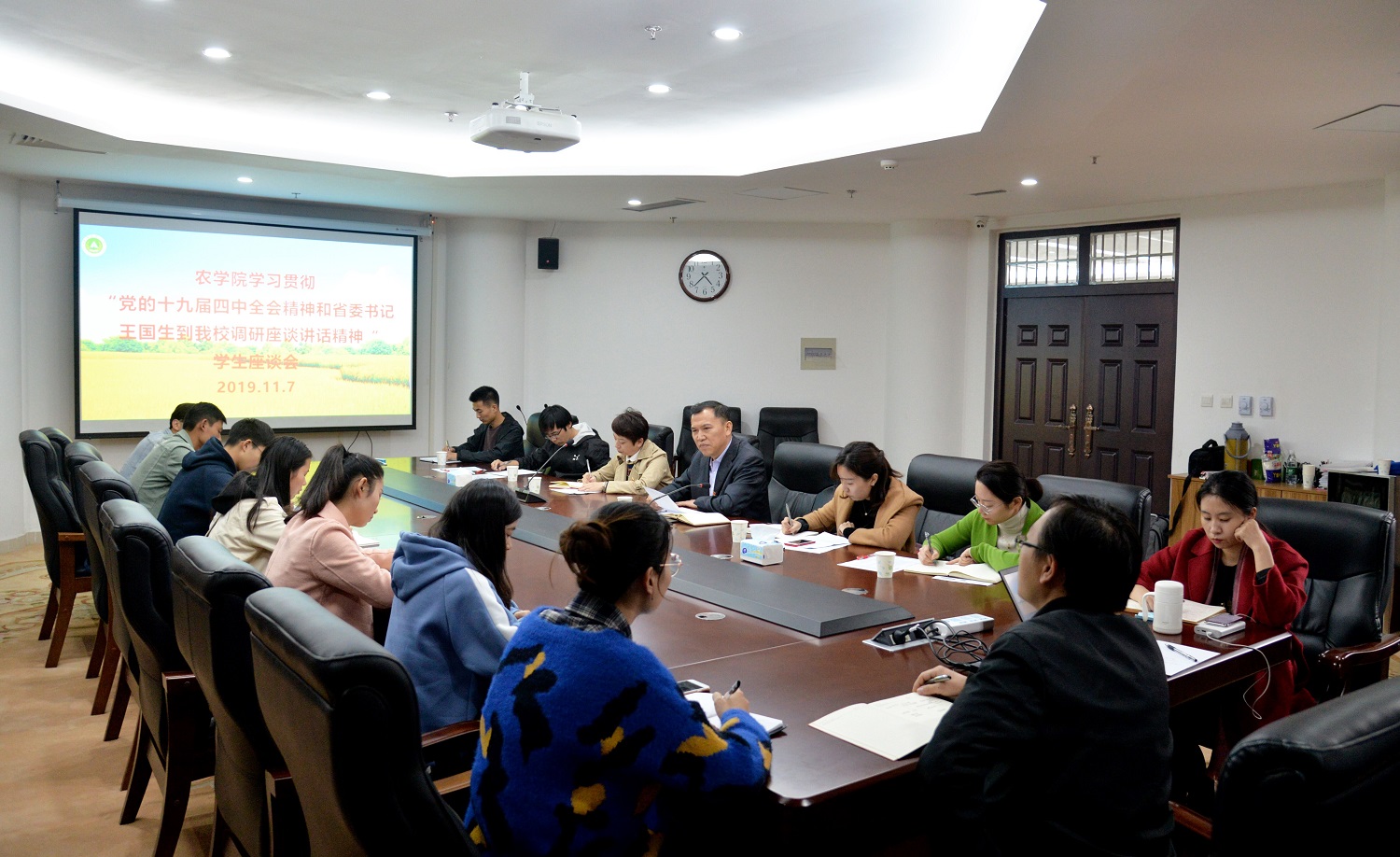 在龙子湖校区实验楼南201会议室召开“学习传达贯彻党的十九届四中全会精神和省委书记王国生到校调研座谈讲话精神”学生代表座谈会,院党委书记陈书章,副书记吴旭静、组织员刘银银,团委副书记徐珂,梁皓,辅导员李盼以及部分研究生、本科生代表参加了座谈会。座谈会由院党委副书记吴旭静主持。