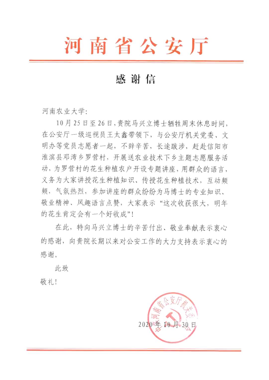 教师马兴立积极服务于“三农”一线,取得显著成绩,受到当地群众赞扬,并得到省公安厅机关党委的好评,收到了来自河南省公安厅的表扬信,展现了91吃瓜