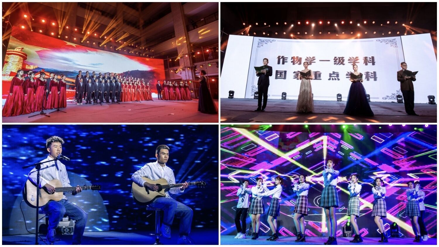 晚会现场,节目精彩纷呈,气氛欢快热烈。歌曲《我和我的祖国》表达了学院师生浓浓的爱国之情;单口相声《喷宝》用精彩的模仿秀,带领观众走进奇闻轶事;拉丁舞《飞》释放音乐的狂热与青春的激情;教师朗诵《你的名字》展现了学院的百年历史和累累硕果,一代代科研人对农学精神的诠释和传承,激励着新一代农学人在奋斗的青春中知农、学农、爱农、弘农;学院阿卡贝拉团队的《稻香》带领观众回归自然纯粹的和谐之美;小品《乌龙快递》以诙谐的语言引得现场掌声不断;学院传媒工作室带来的舞蹈《barbarbar》展现了农院学子的青春活力;太极《云中山河》让观众身临其境感受“以柔克刚,以静制动”的魅力;歌曲联唱《写给黄淮》《飞鸟与蝉》《凉凉》《光阴的故事》一展同学们的青春风采;幕布剧《致青春》精彩纷呈,勾勒出了大学生活的点点滴滴;朗诵《致敬英雄》饱含着坚定与激情,感染了现场的每一位观众;合唱《国家》展现了学院教师昂扬的精神风貌,唱出了对家国的拳拳之爱。晚会期间的三次抽奖环节也极尽有趣,“摇一摇”点燃了现场观众的热情,丰厚的特等奖奖品在现场颁发让获奖师生惊喜不已。最后,伴随着一首《难忘今宵》,全体师生进行了合影留念,晚会落下帷幕。