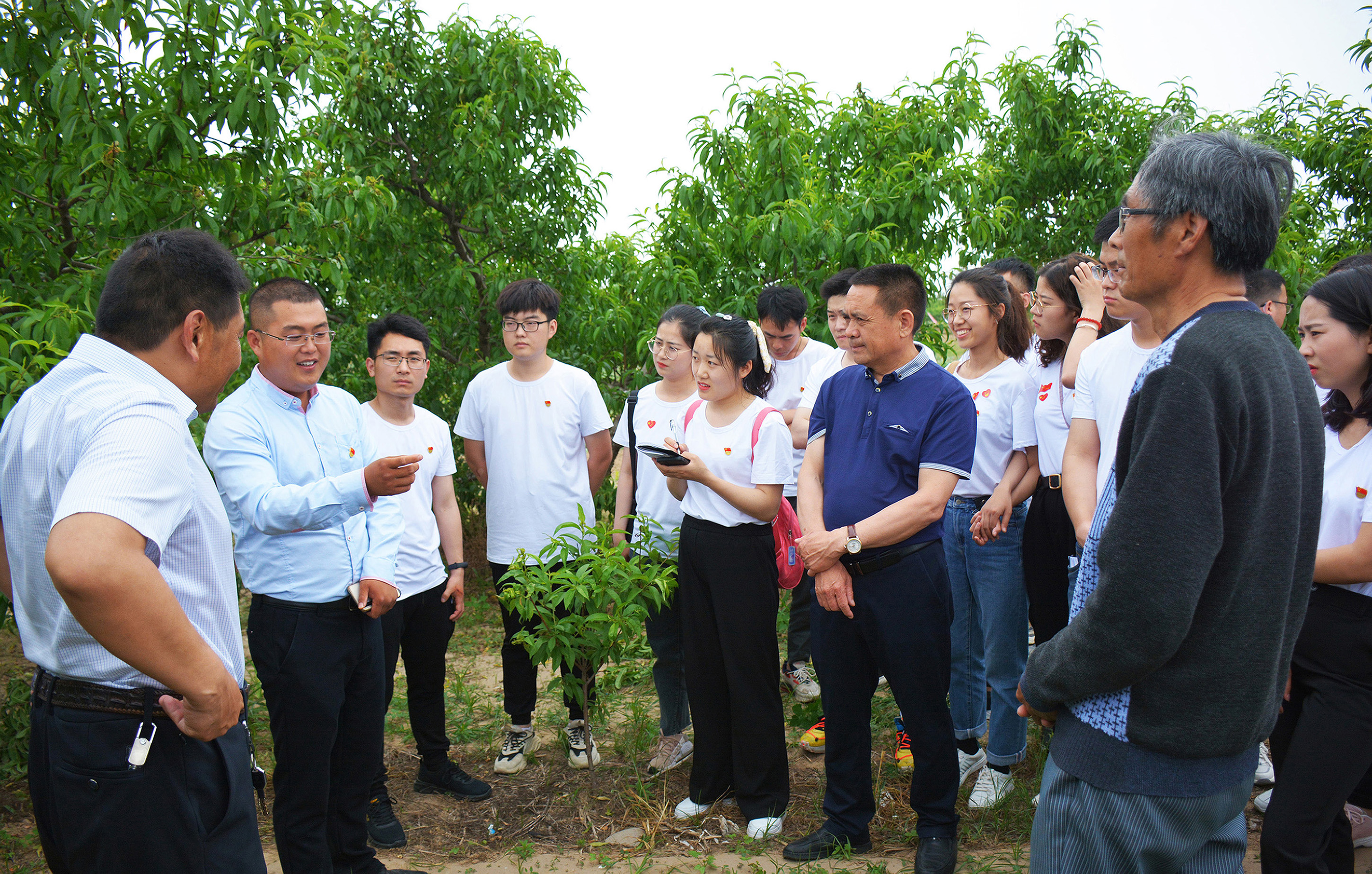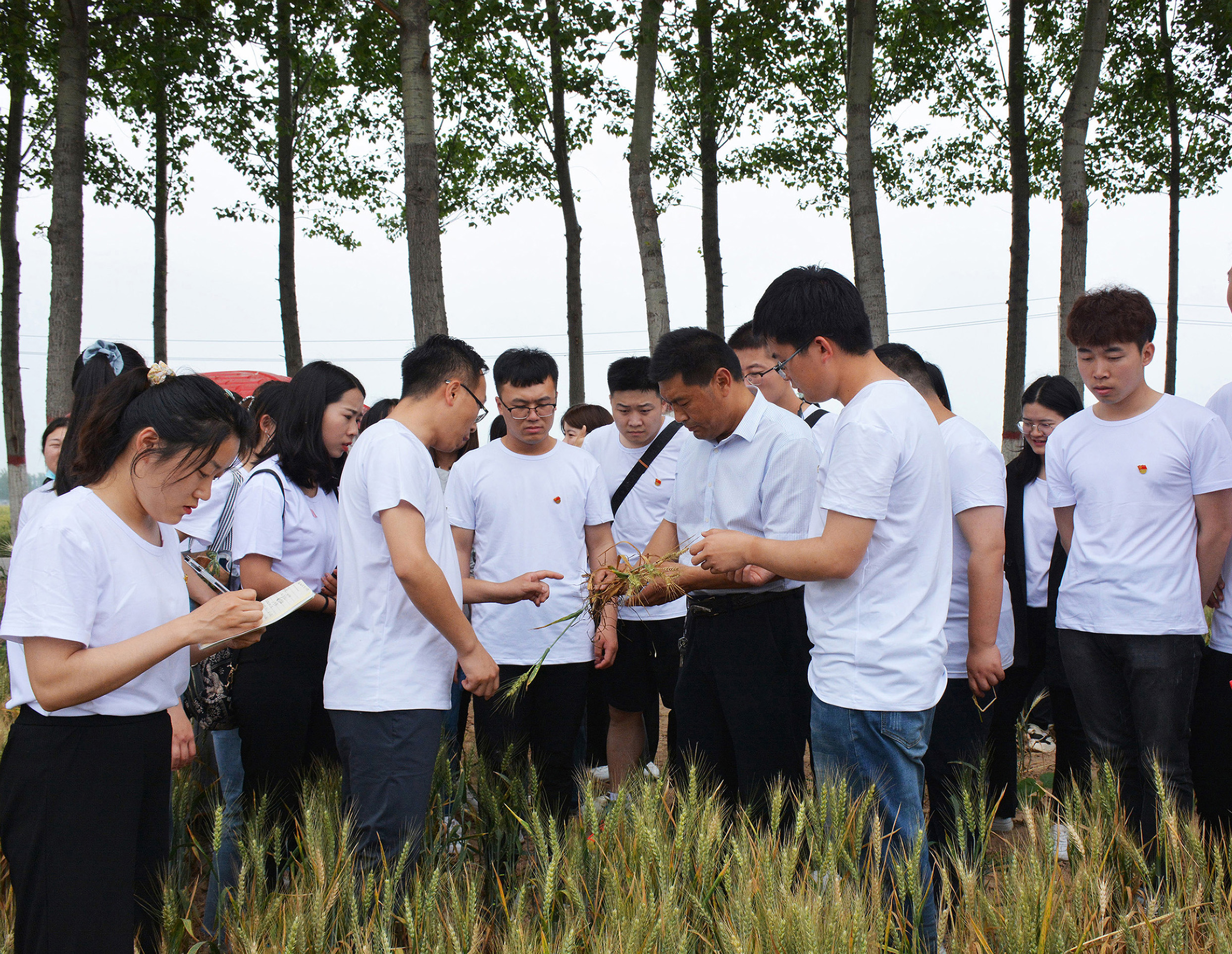 参观学习结束后,研究生党员又赶往榆林郭村大桃种植基地、小麦种植基地。就病虫害防治、树形修剪等方面的问题与村干部和园区工人进行交流,并对农户种植的冬小麦出现的茎基腐病、白粉病进行了评估分析,对种植户最关心的防治病虫害、农药施用、种植密度、收获最佳时间、小麦品种品质优化等进行详细解答和建议。