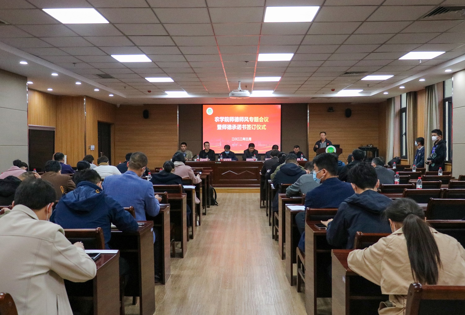 在第一实验楼南321会议室,召开师德师风专题会议暨师德承诺书签订仪式。党委教师工作部副部长、教务处副处长王金铎,在校的院领导班子成员、党支部书记、系(室)及中心主任、国家级平台主任等近30人参加会议。会议由院党委副书记王建忠主持。