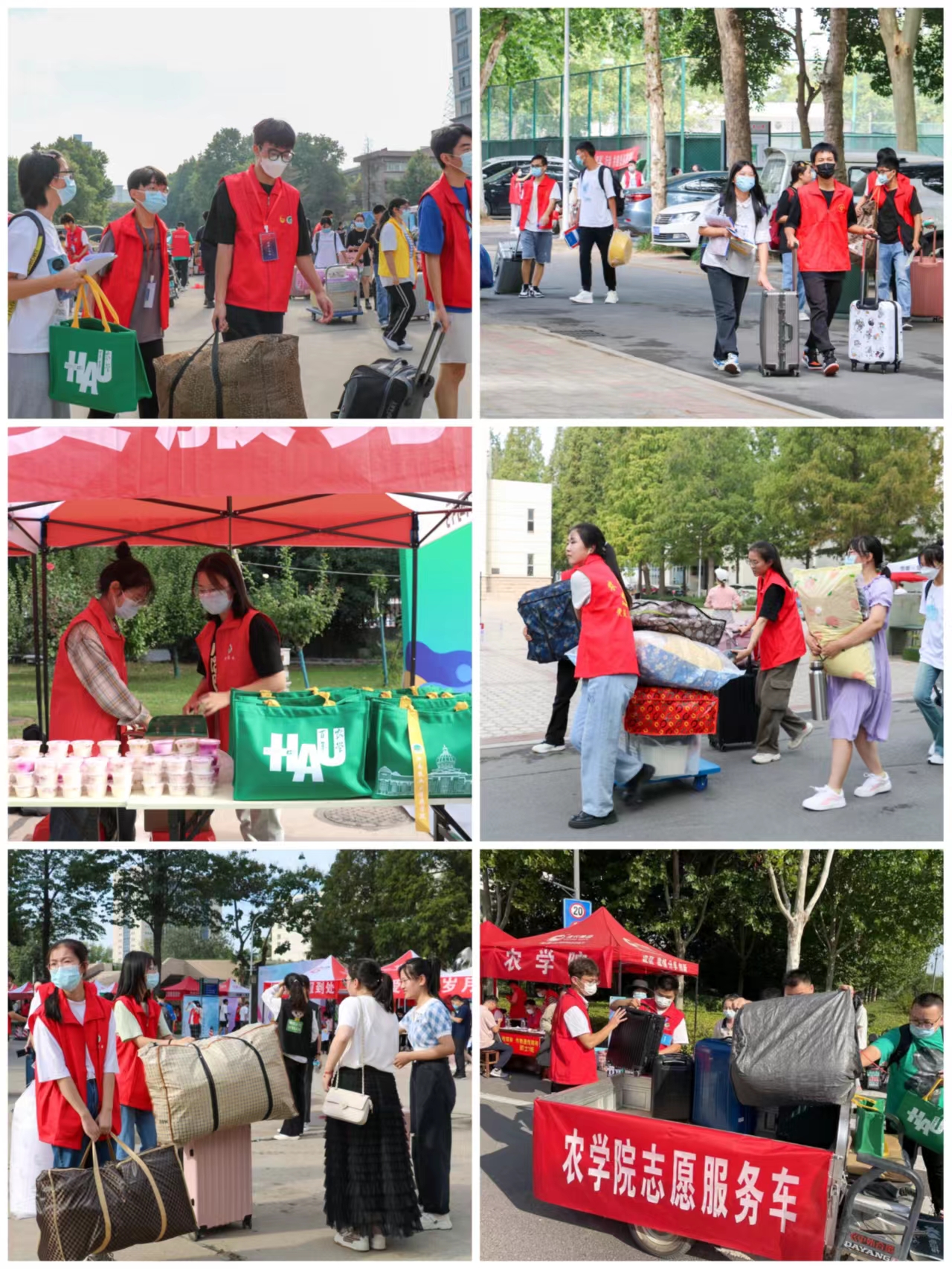 众多的迎新志愿者们微笑着迎接刚走到校门处的新生,一边说着“你好”、‘“欢迎来到农大”,一边“抢”下新生和校门外家长手中沉重的行李,对每一位新同学,志愿者们都给予亲切问候。签到、领取学生卡、确认入学信息、领取暖心大礼包……新生们在志愿者的指引下来到各自的报到处,热闹有序地完成了开学报到。学院采取志愿者“一对一”对接新生策略,方便学生入校,并安排志愿服务车不断往返于报到处与宿舍之间,帮助运送新生及其行李。