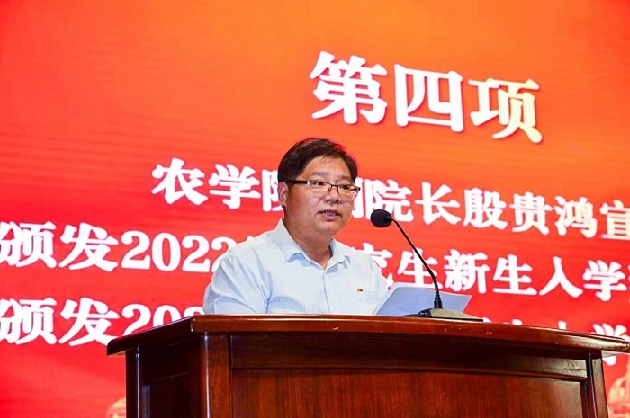 副院长殷贵鸿宣读《关于颁发2022级研究生优秀新生奖学金的决定》和《关于颁发2022级本科生优秀新生奖学金的决定》