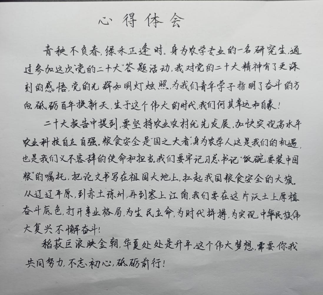 比赛结束后,玉米栽培生理研究生党支部的王山聪同学表示:“通过此次活动,我对党的二十大精神有了更加深刻的理解,过去五年取得的重大成就和新时代十年的伟大变革,让我们更加坚定了理论自信,也为我们青年一代成长发展提供了历史际遇。二十大报告中提出“要加快建设农业强国,全方位夯实粮食安全根基……确保中国人的饭碗牢牢端在自己手中”。去年我有幸考上了农院研究生,作为一名农学学子,将学思践悟,不断提升专业本领,认真做好自己的每一步实验,不怕苦累,学农爱农强农兴农,为实现“端牢饭碗,饭碗主要装中国粮”贡献自己的一份力量。”此外,各党支部提交了二十大学习心得体会手稿。
